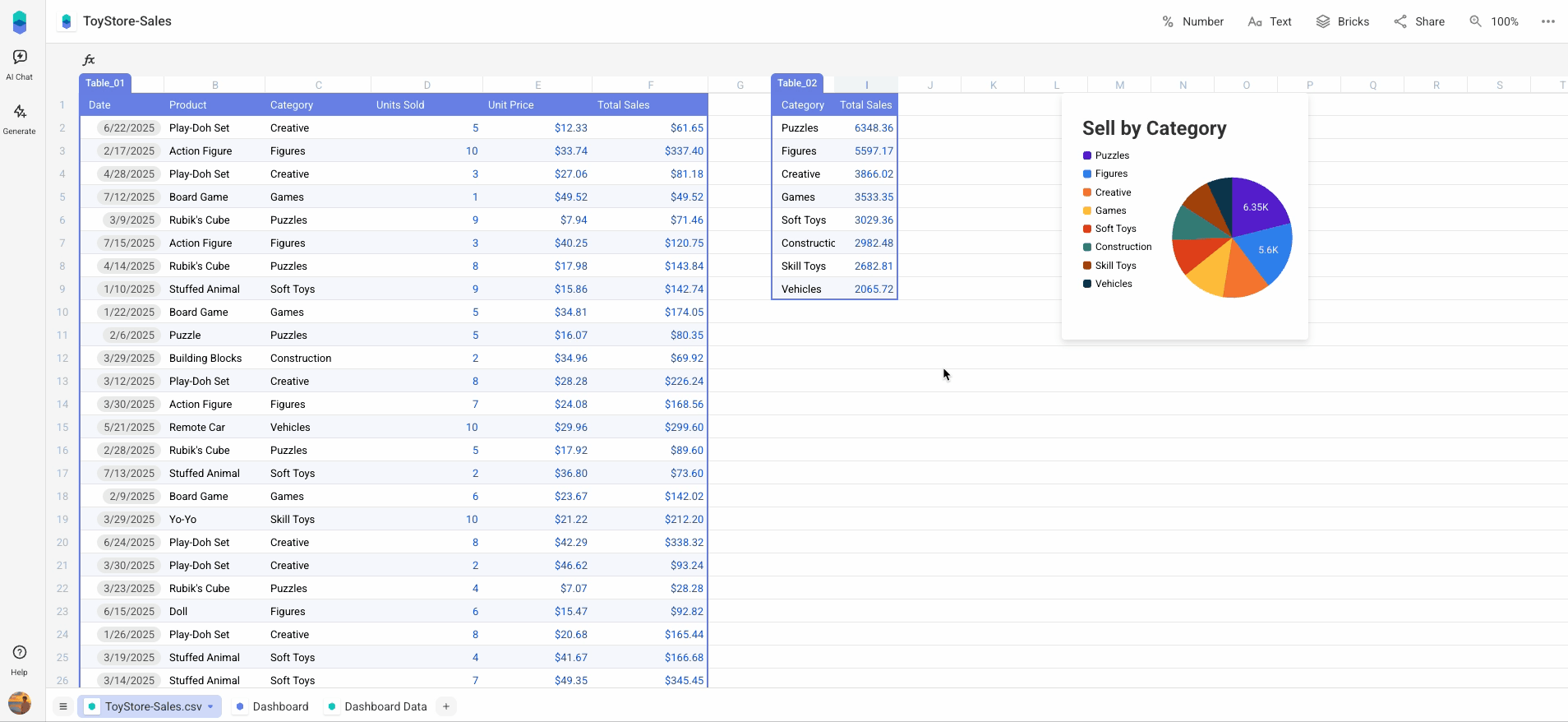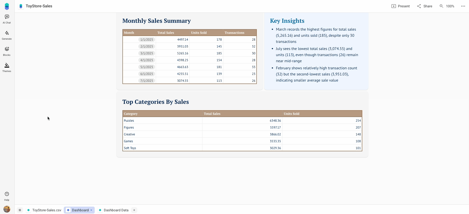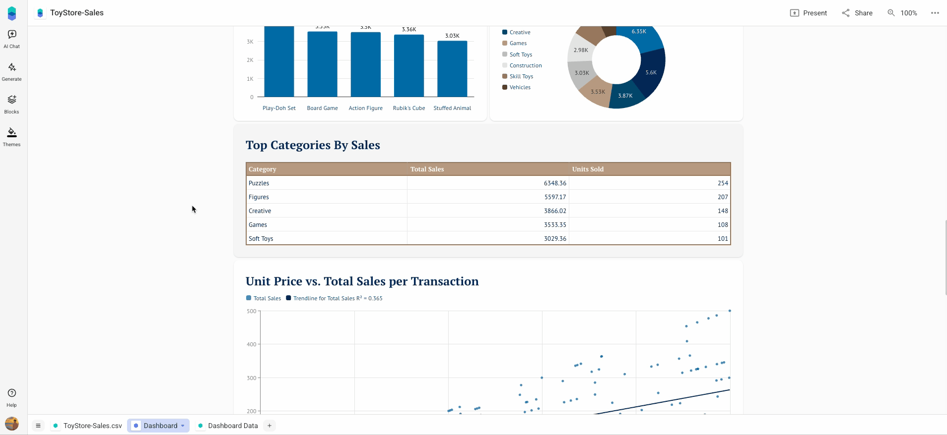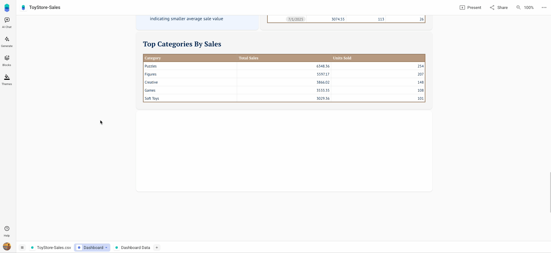 - The chart or table will be added as a new block, automatically linked to its original source—so it stays updated as your data changes.